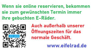 Wir, das Team von eifelRAD, sind Ihr Partner in der Erlebnisregion Eifel. Als eines der umfangreich ausgestatteten örtlichen Elektro-Fahrrad-Vermietgeschäfte unterstützen wir den regionalen Tourismus mit der Bereitstellung von hochwertigen E-Bikes, der Marken Victoria, Conway, R-Raymon. In einem Netz von ausgewählten Hotels, Apartment-Anlagen, Ferienhäusern, Pensionen und touristischen Einrichtungen sorgen wir mit unserem Service für einen einwandfreien Zustand der Mieträder.